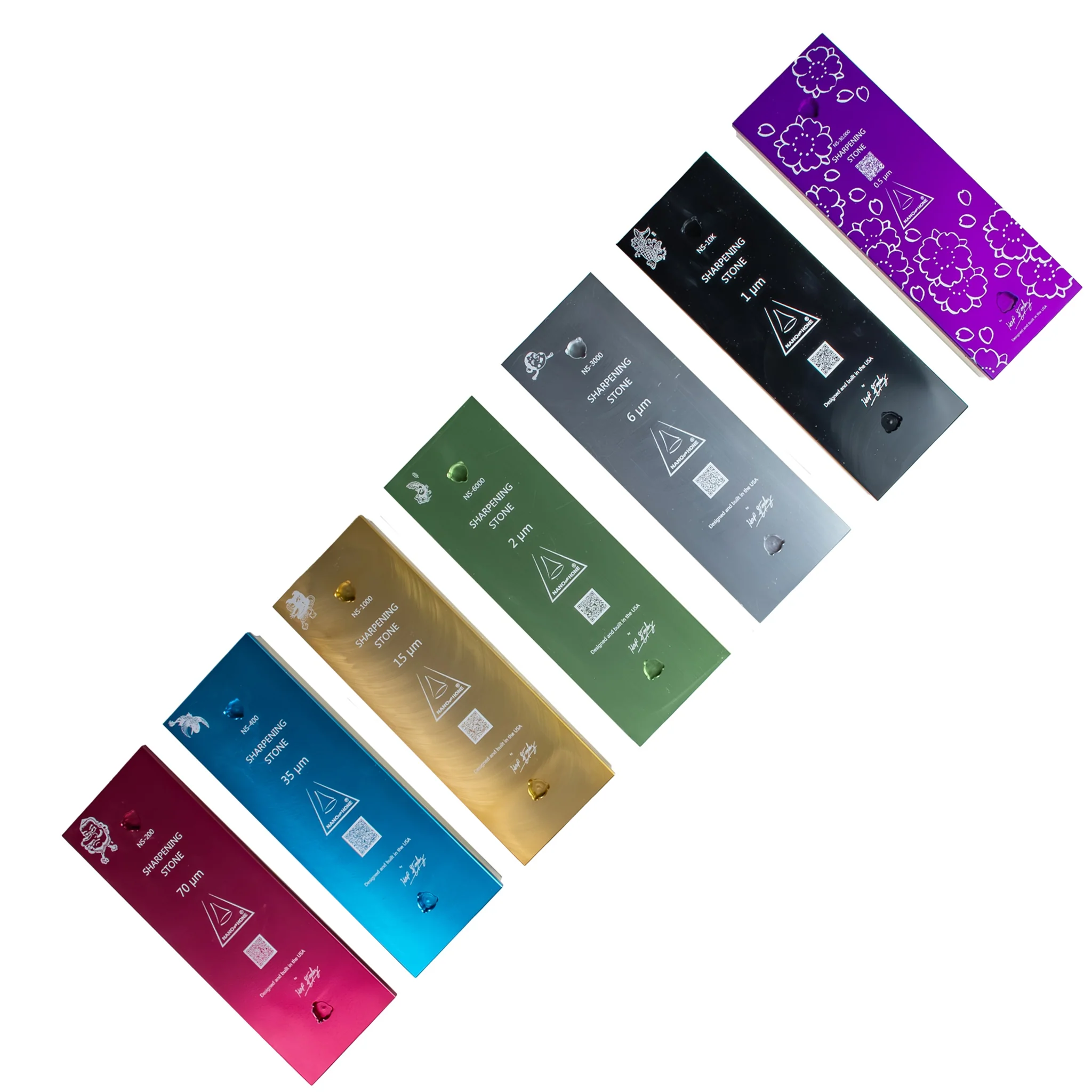 All Nano Hone Water Stones are on anodized aluminum plates that are machined for flatness. Having the stones mounted in the fashion has several benefits: the stones are protected, the aluminum is laser engraved and color coded for easy identification, and because the stone remains effective until its copy paper thin, the life of the stone is significantly increased.