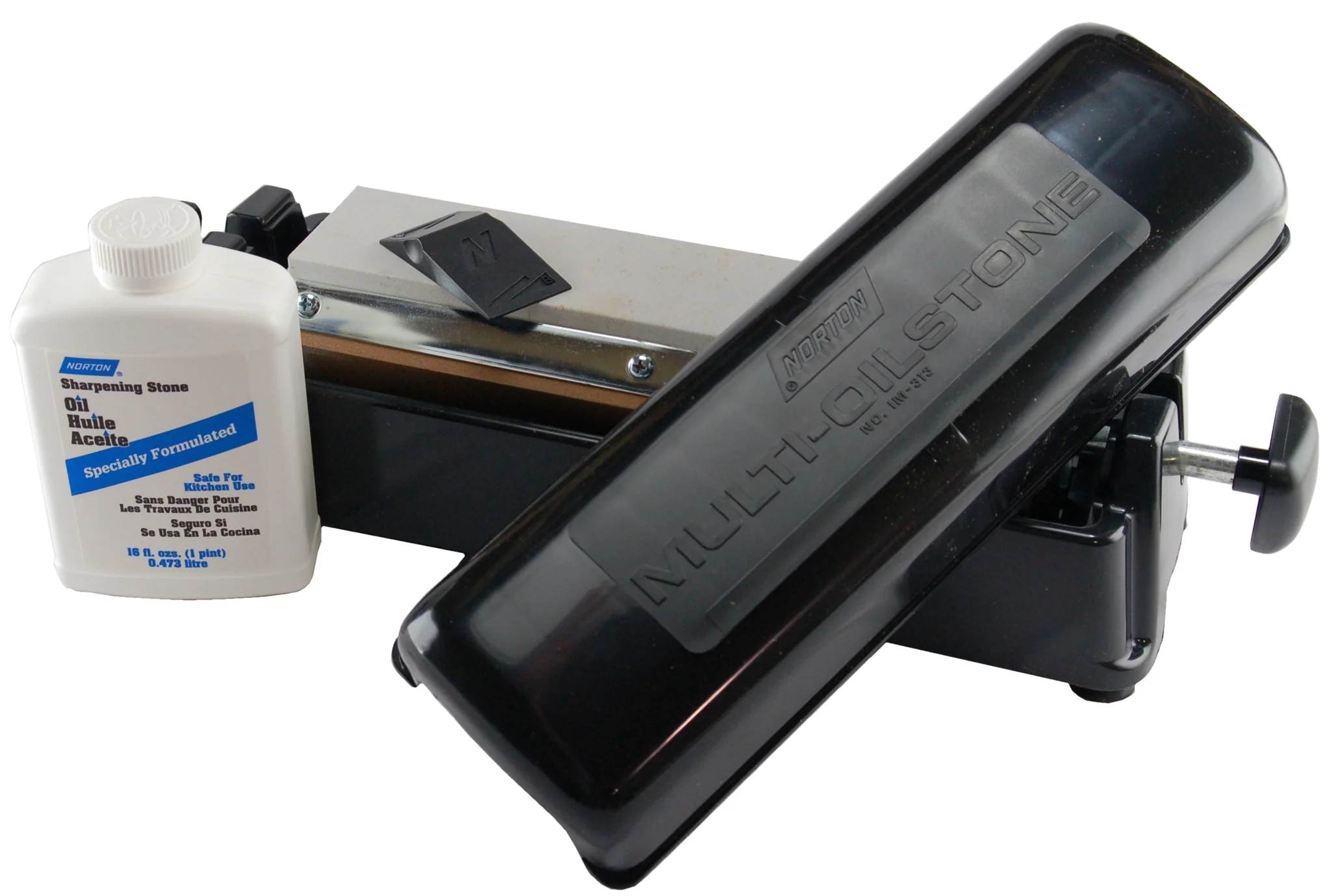 The Norton IM313CIS features three very large 11-1/2" x 2-1/2" oil stones in a convenient, easy-to-use system. These stones are long enough to handle any knife or tool thrown at them. The sharpening system holds the stones in a heavy-duty plastic base unit that mounts into an oil bath. The oil reservoir keeps the stones that are not being used submerged in the oil so they're ready to use.The system comes with everything you need to get sharpening, 16 ounces of quality Norton Honing Oil are included.