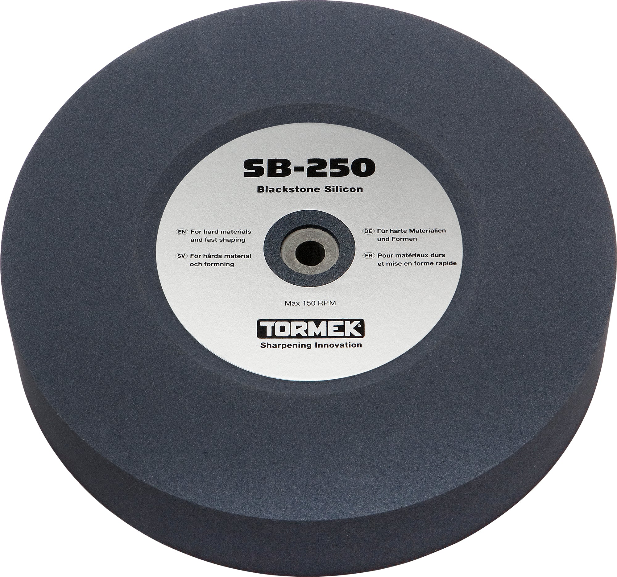 The Tormek SB-250 Blackstone Silicon has been developed for shaping and sharpening HSS and exotic alloyed steels. It can also touch up tungsten carbide. It does not offer faster steel removal on ordinary carbon steel. The combination of abrasive hardness, shape and grain size is optimized to work efficiently at the Tormek system’s low RPM. Its faster material removal is an advantage especially when shaping tools with a large bevel surface, where the grinding pressure is limited, for example, planer blades and woodturning skews. This Grindstone measures 10" in diameter and 2" wide. For metric folks, that is 250MM x 50MM.